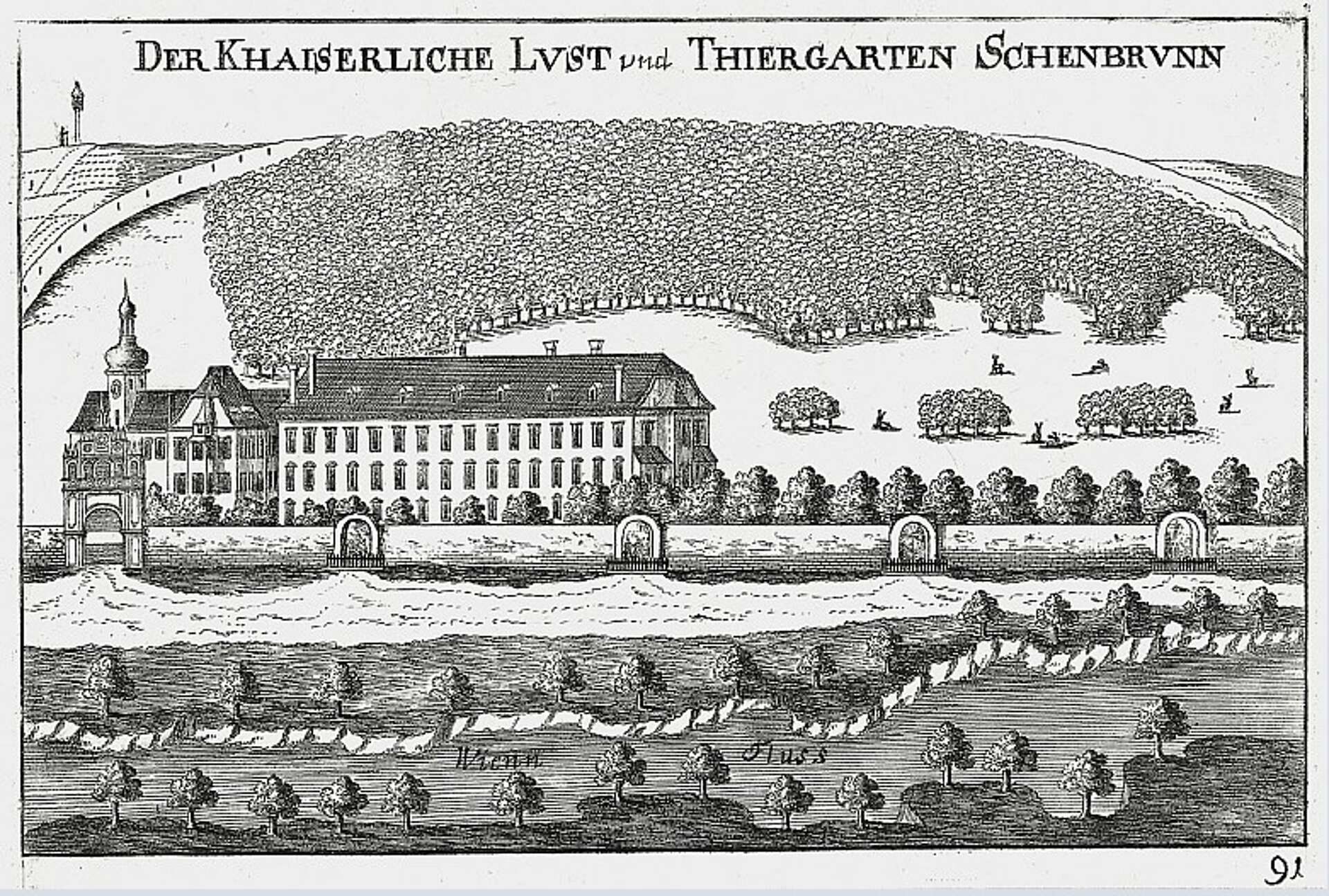 Von den mit der zweiten Türkenbelagerung einhergehenden Verwüstungen im Jahre 1683 blieb auch Schönbrunn mit Lusthaus und Tiergarten nicht verschont. Kaiser Leopold I., in dessen Besitz sich das Schloss seit 1686 befand, fasste den Entschluss, Schönbrunn dem Thronfolger Joseph zu überlassen und für diesen einen repräsentativen Neubau zu errichten. Als bald darauf durch adelige Vermittlung der in Rom ausgebildete Architekt Johann Bernhard Fischer von Erlach an den kaiserlichen Hof kam, legte dieser 1688 dem Kaiser den sogenannten „Schönbrunn I-Entwurf“ vor, mit dem er sein architektonisches Können unter Beweis stellen und damit das kaiserliche Interesse gewinnen wollte. Fischer wurde daraufhin 1689 zum Architekturlehrer des Thronfolgers ernannt und reüssierte in der Folge zum meist beschäftigten Architekten des Hofes und des Adels.
