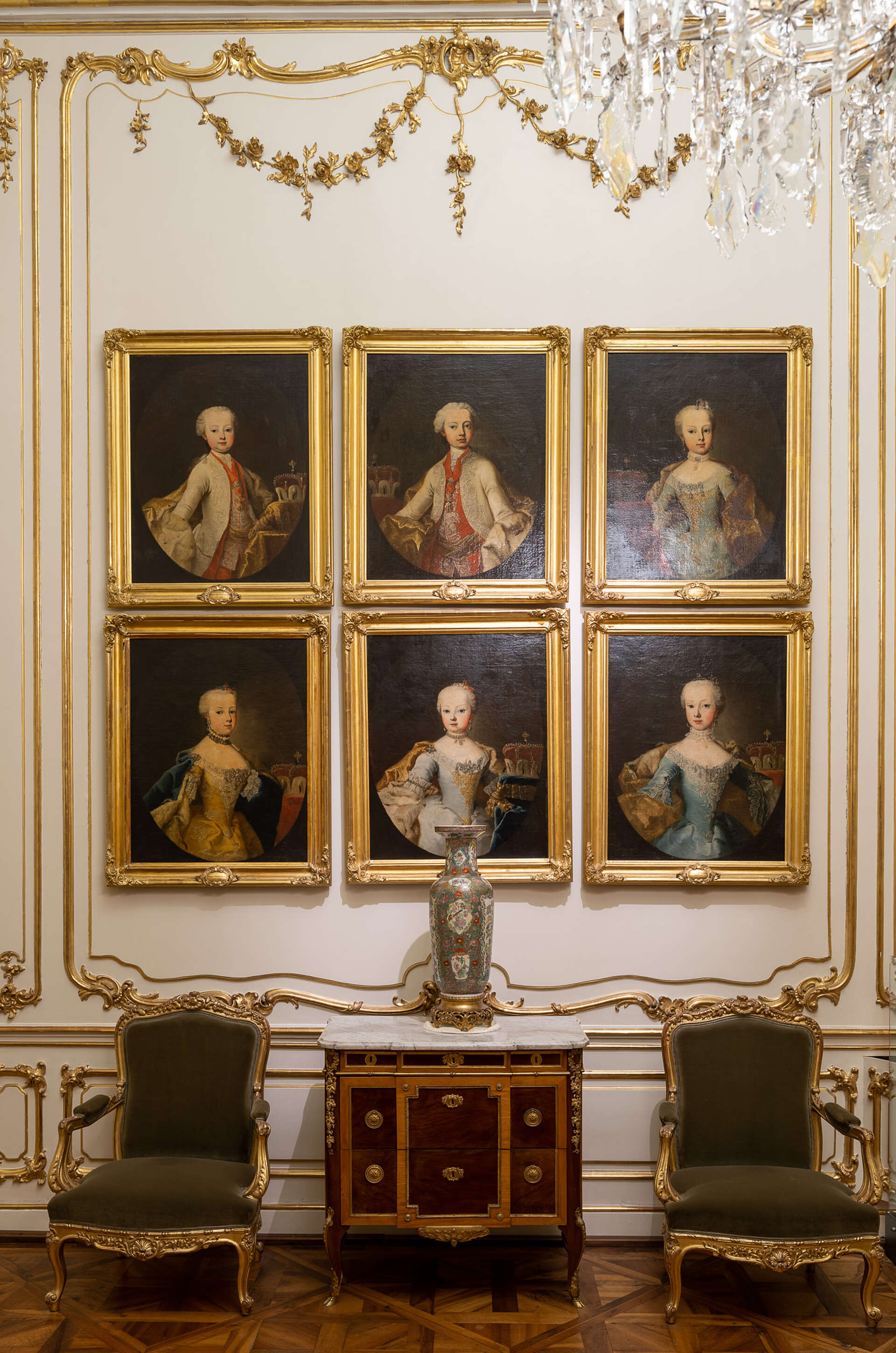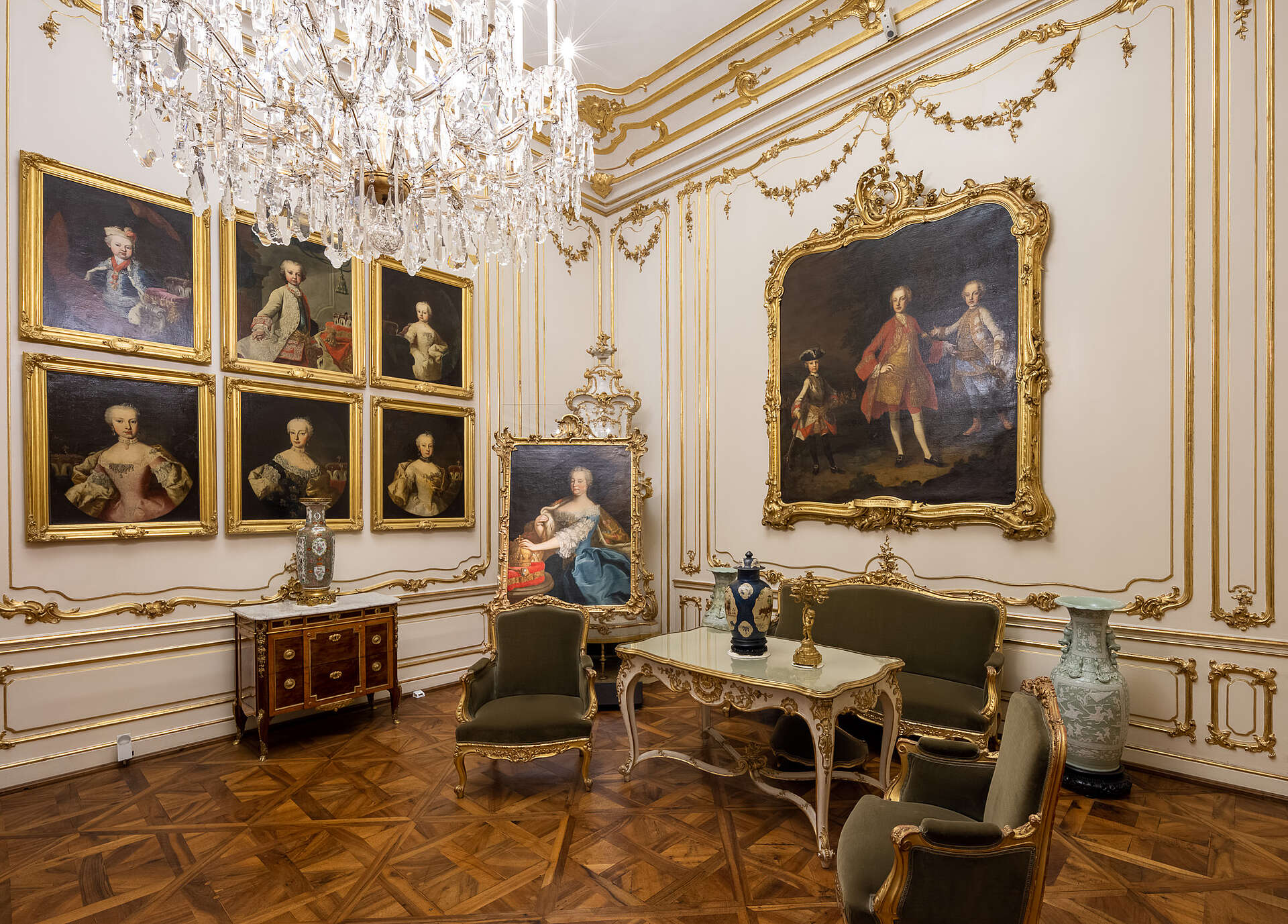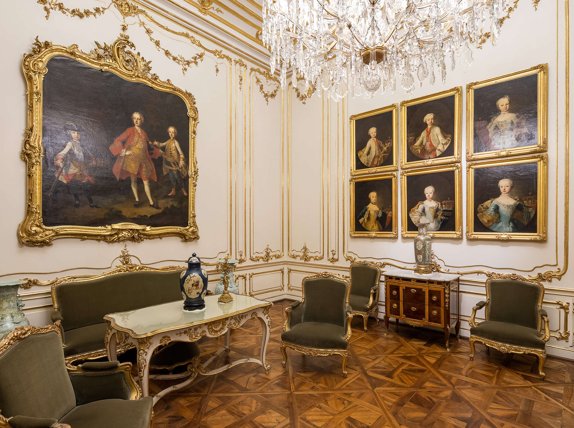 Die zahlreichen Gemälde im Balkonzimmer zeigen Maria Theresia und ihre Kinder. Die Porträts stammen aus der Werkstätte des Hofmalers Martin van Meytens.