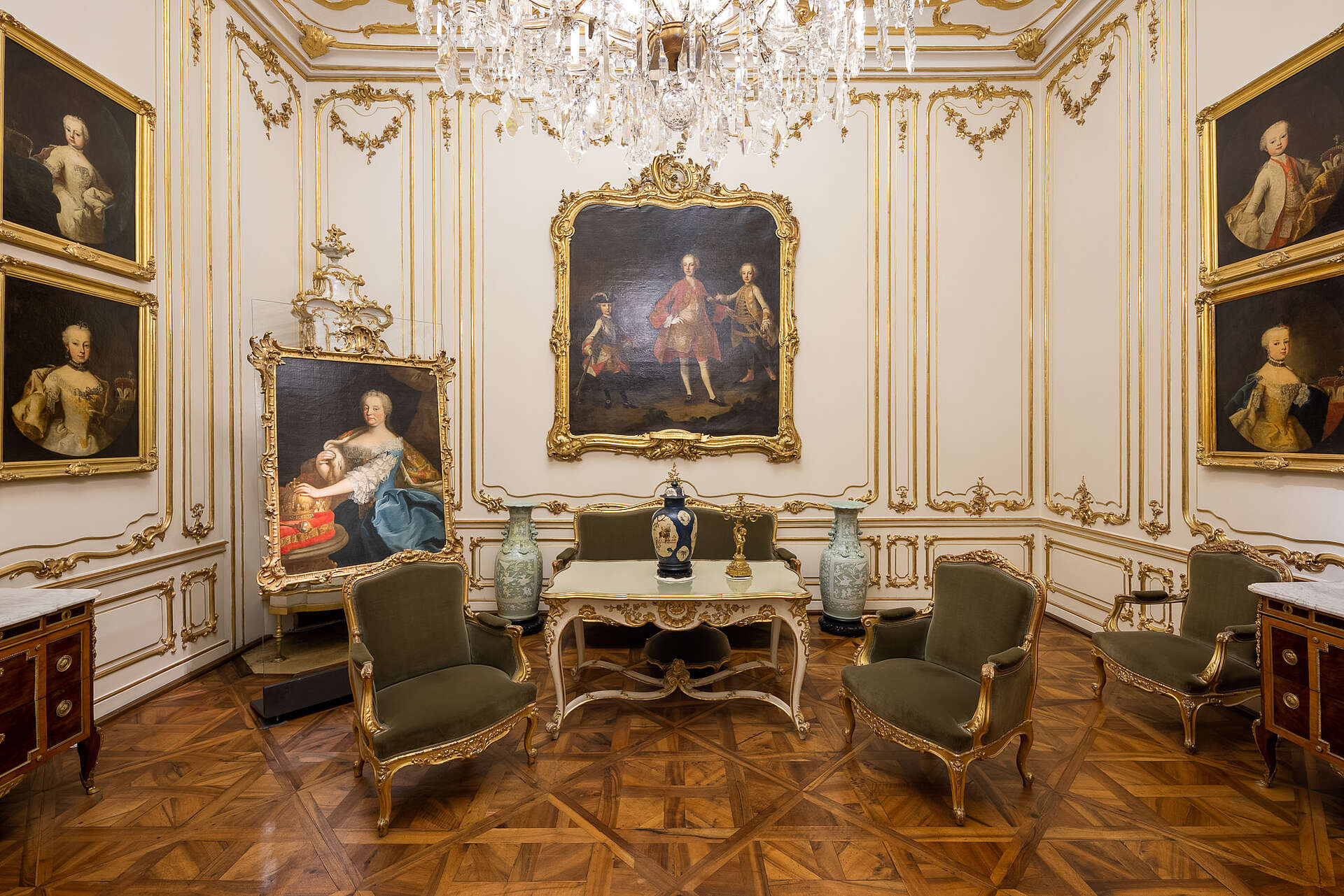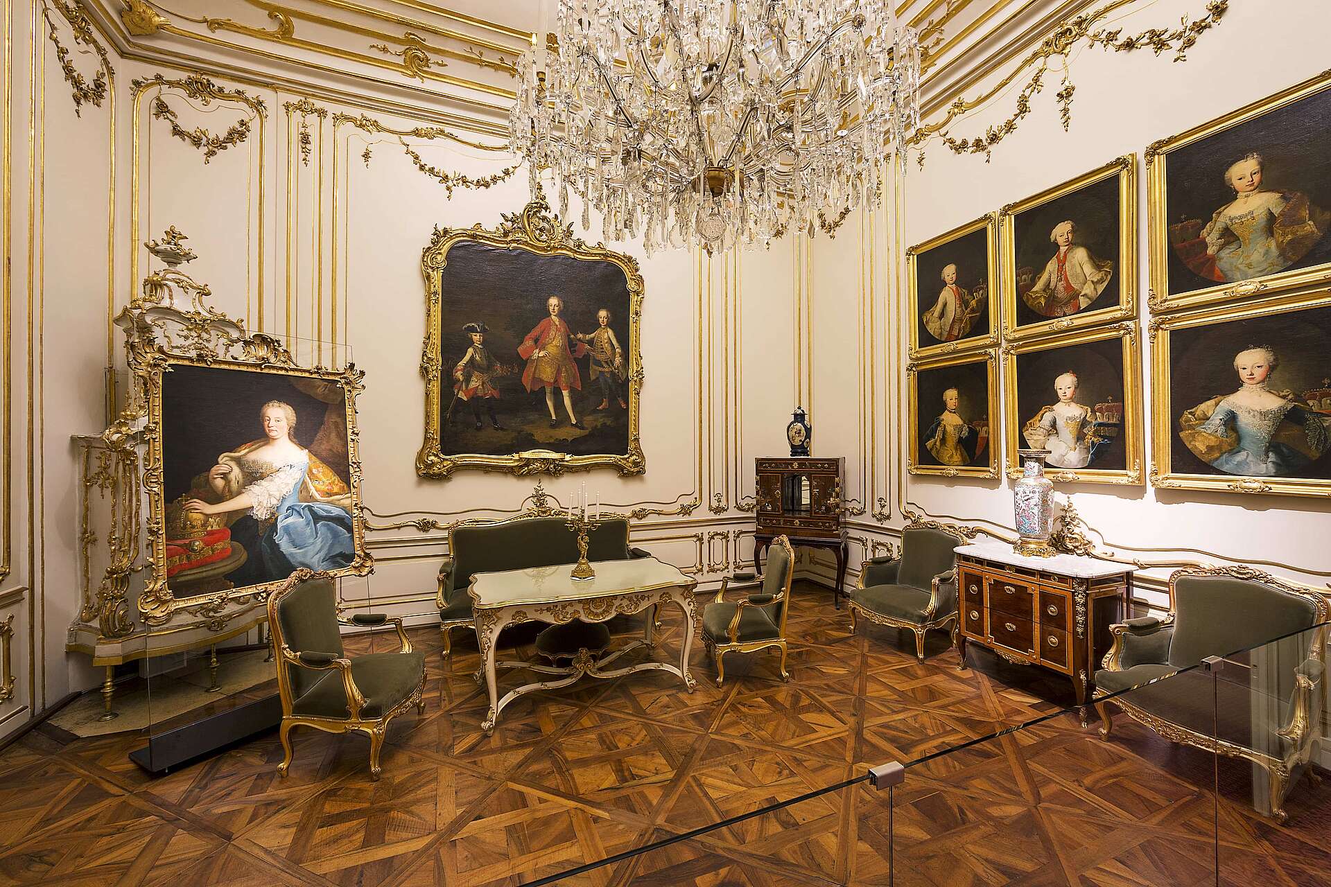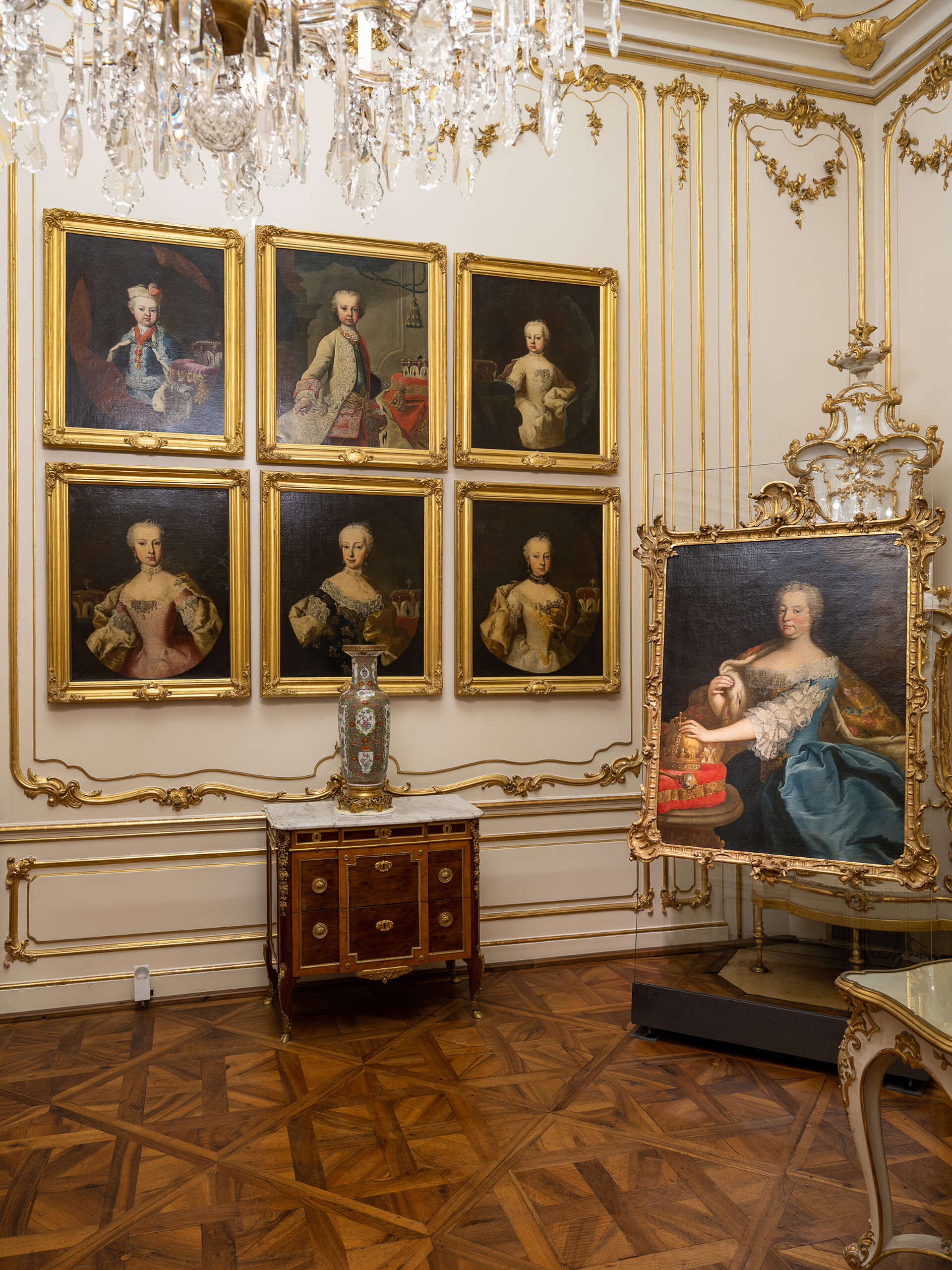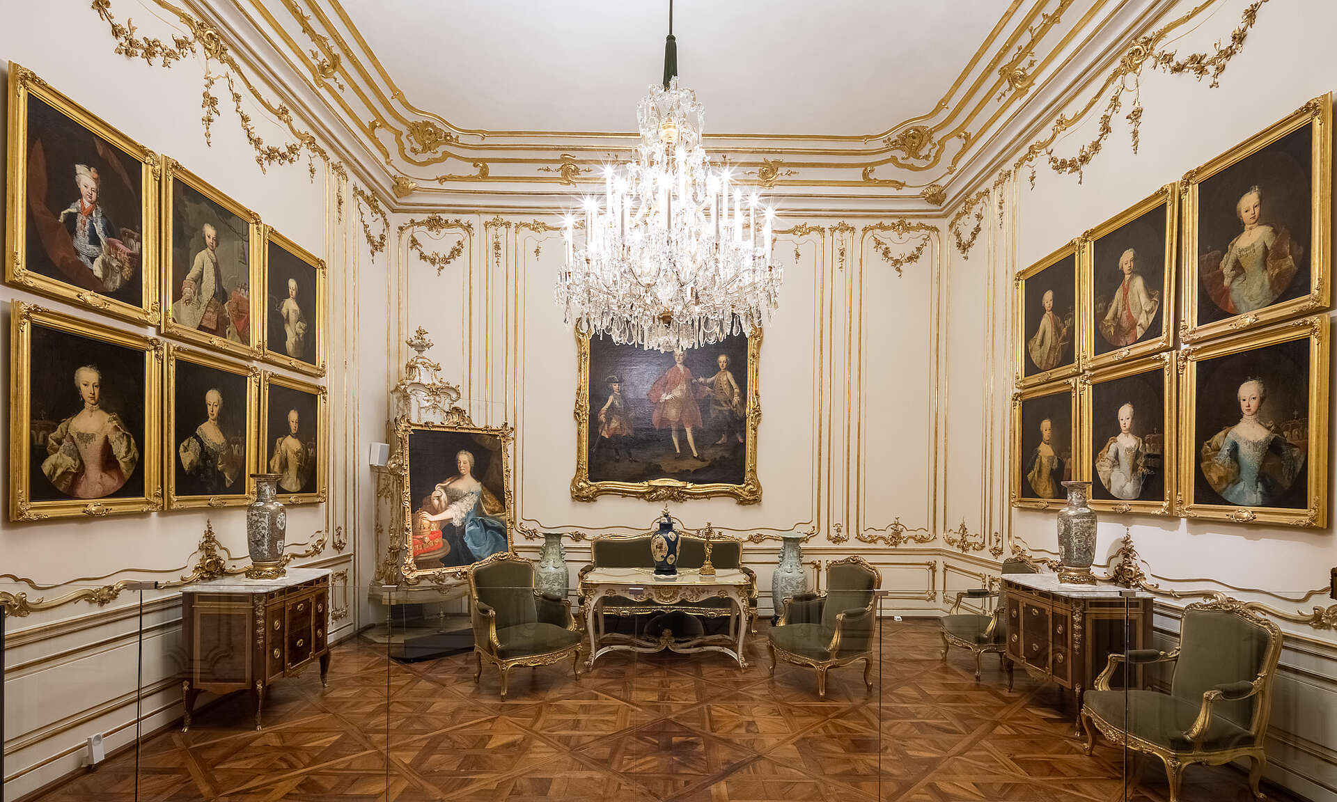 Die zahlreichen Gemälde im Balkonzimmer zeigen Maria Theresia und ihre Kinder. Die Porträts stammen aus der Werkstätte des Hofmalers Martin van Meytens.