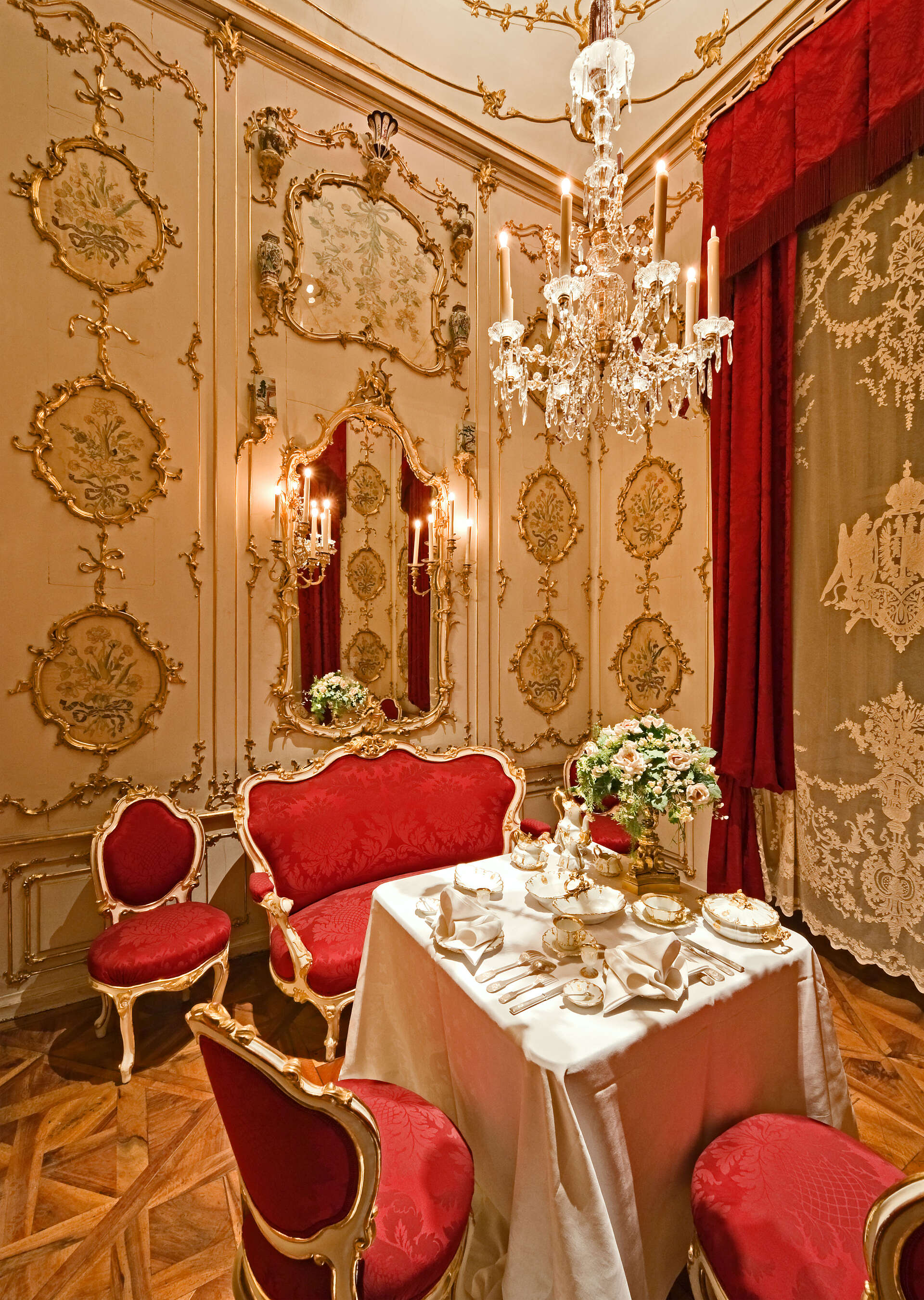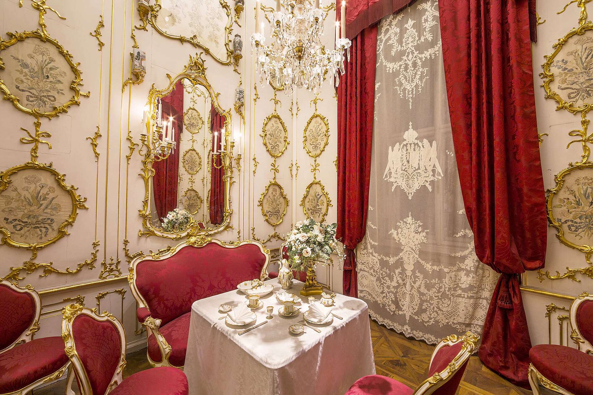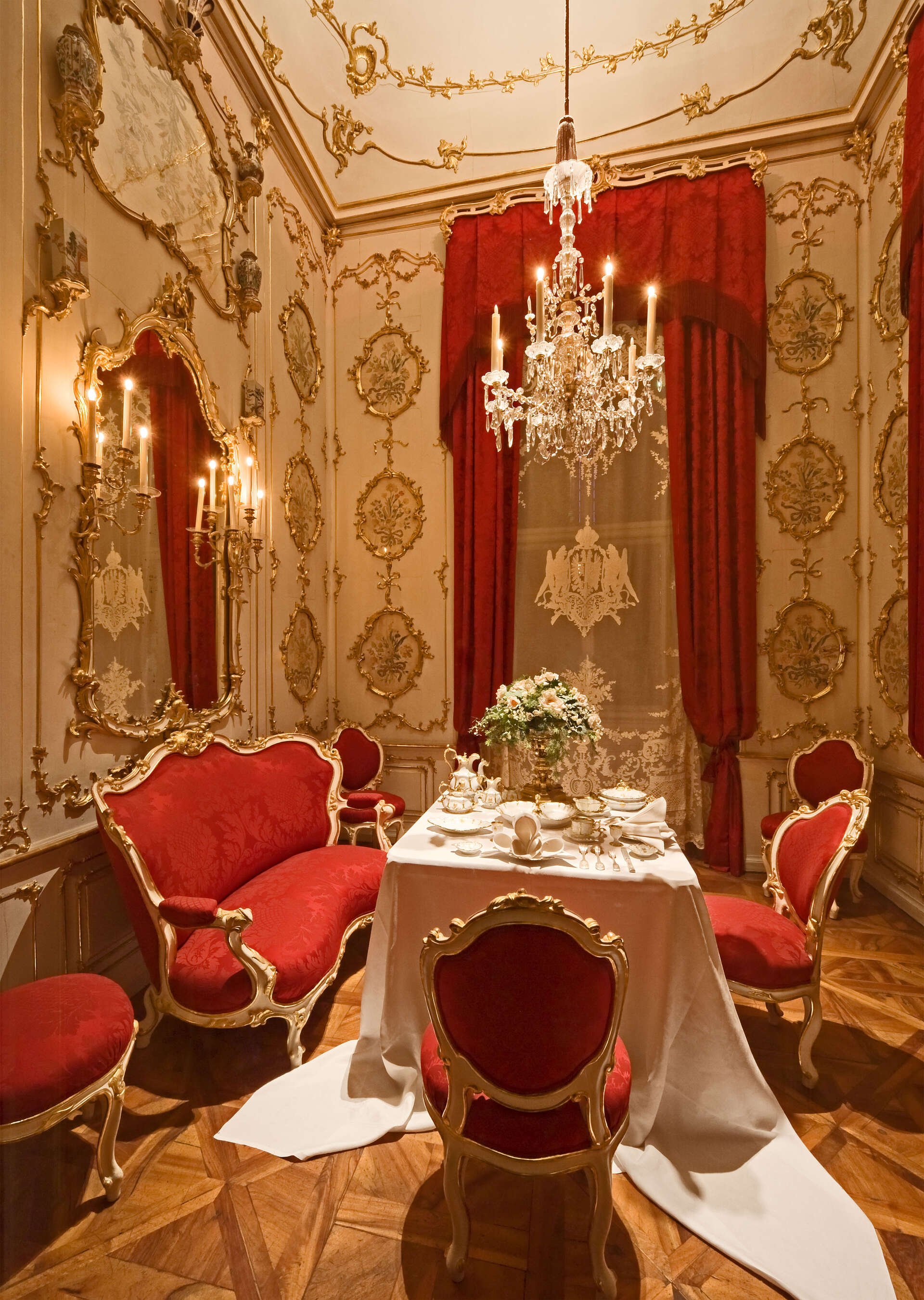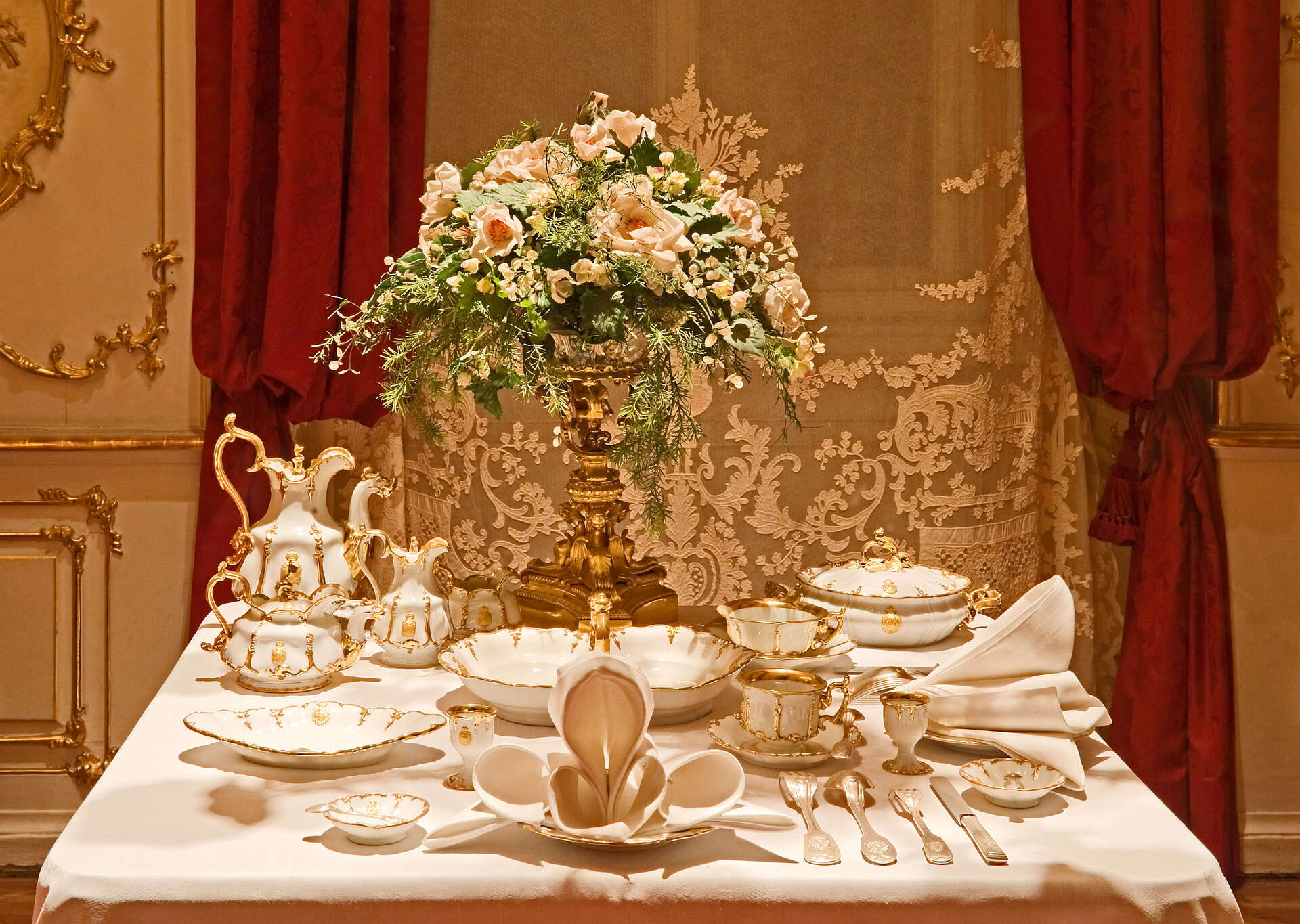 In der Mitte ist ein mit Porzellan der Thun’schen Porzellanmanufaktur im böhmischen Klösterle aus den Beständen der ehemaligen Hofsilber- und Tafelkammer gedeckter Frühstückstisch aufgestellt.