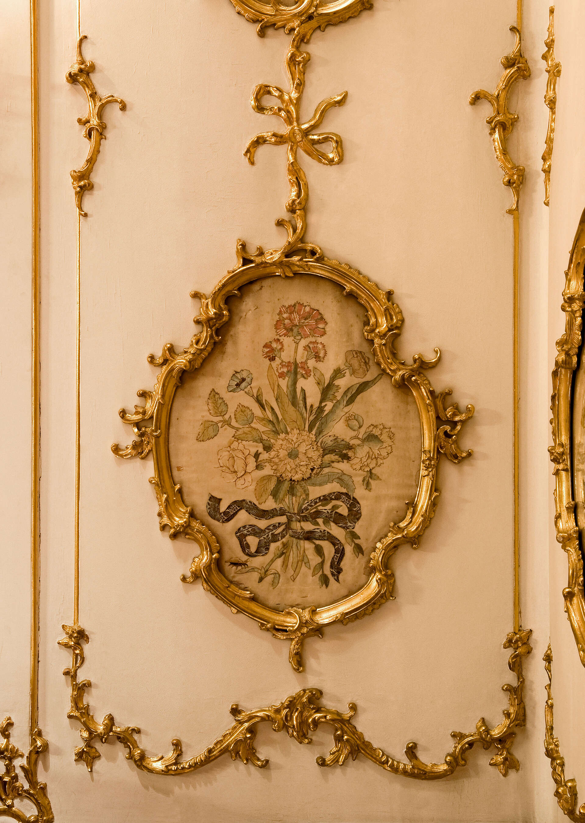Seinen freundlichen Charakter verdankt dieses kleine Eckkabinett den textilen Blumendarstellungen, die in vergoldete Rahmen eingefasst in die Wandvertäfelung eingelassen sind.