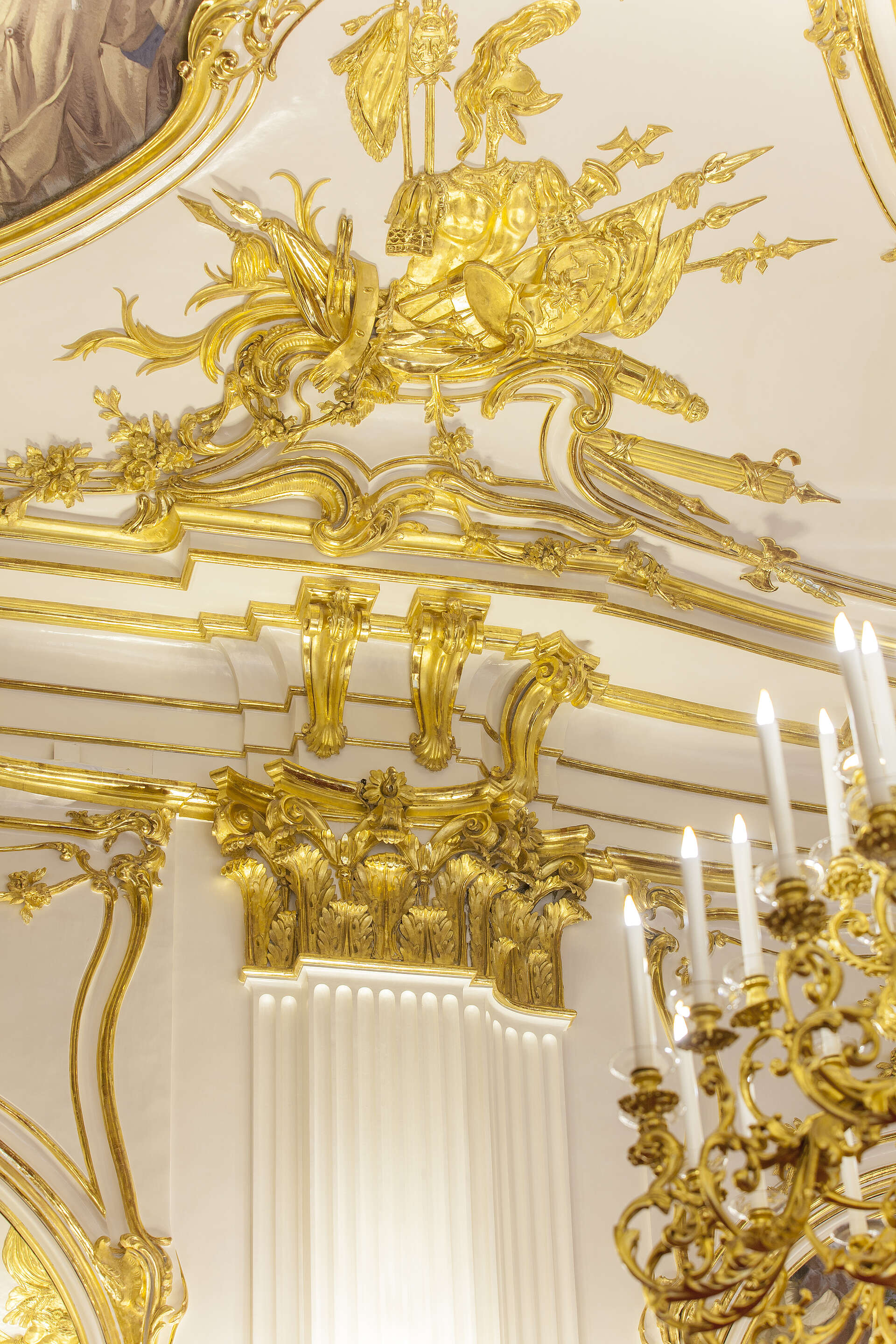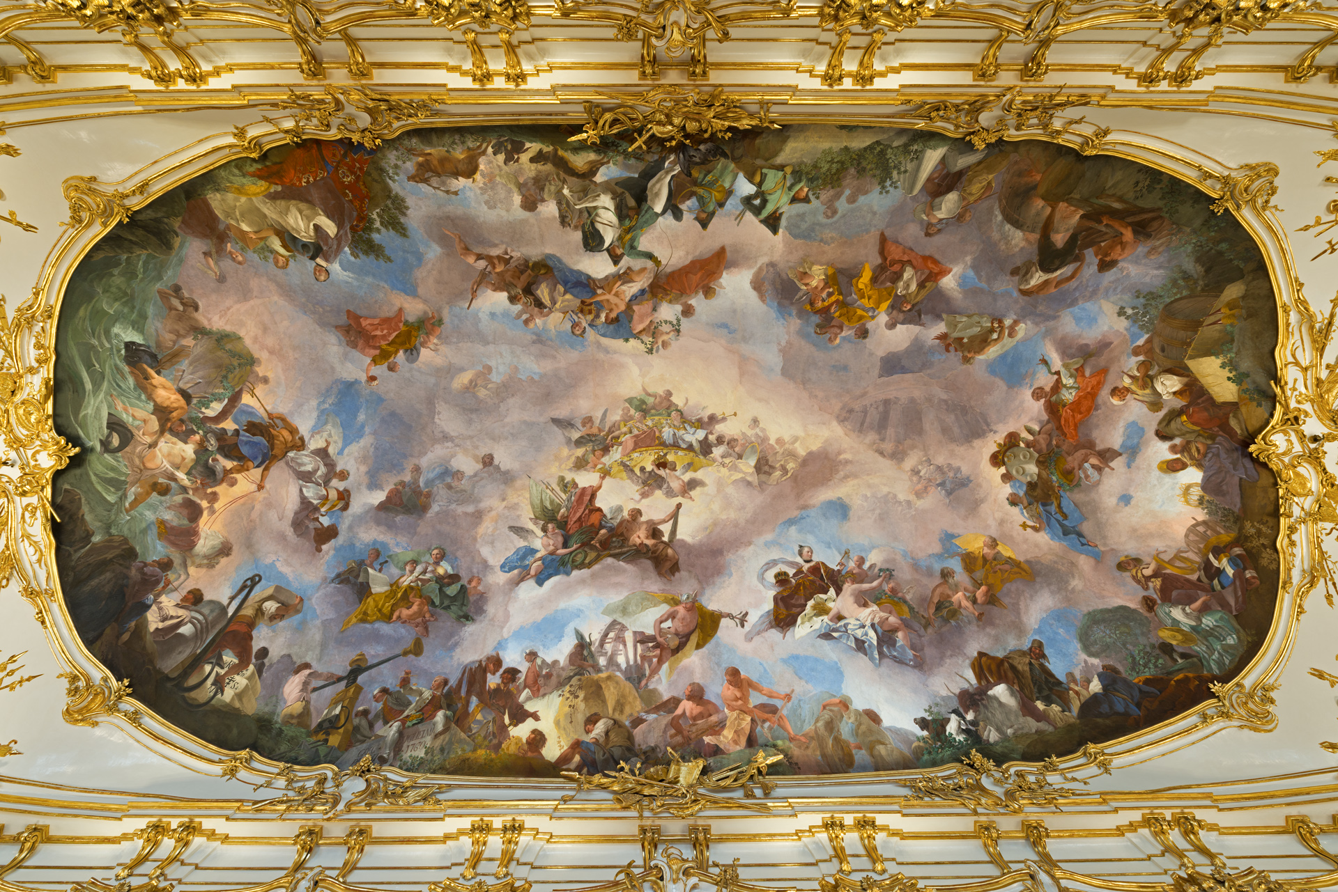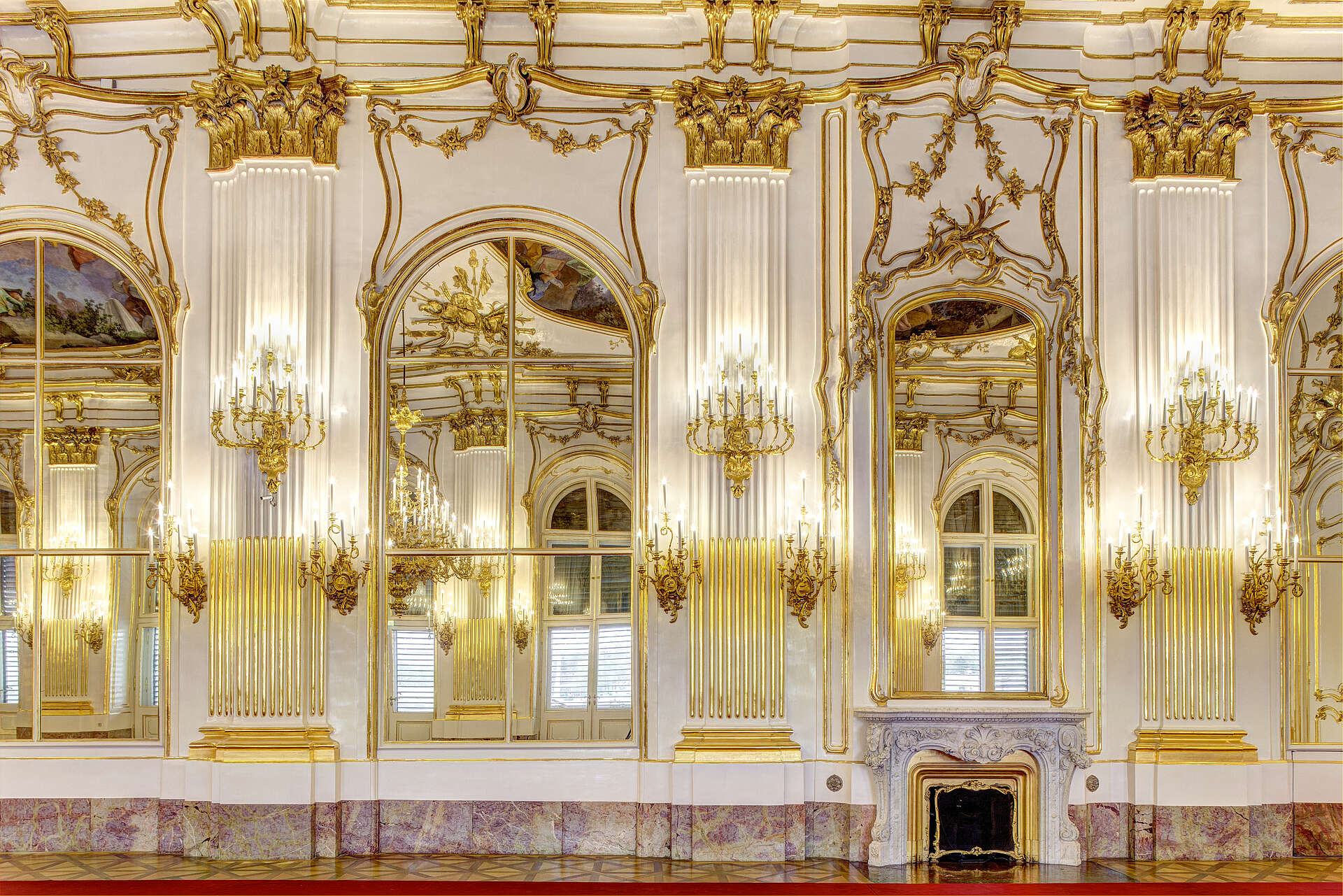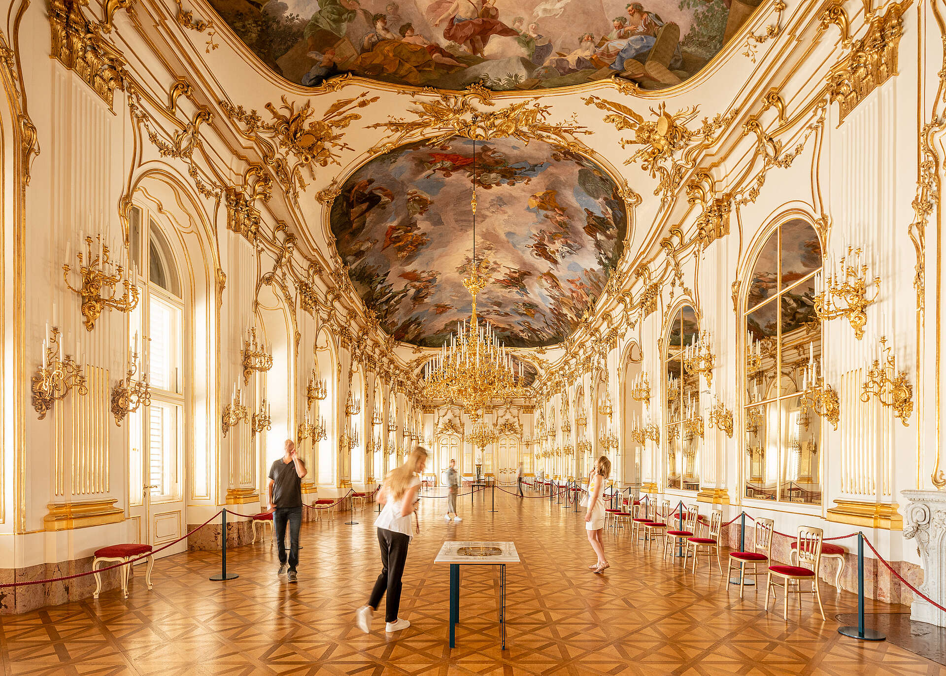 Mit einer Länge von 43 Metern und einer Breite von fast zehn Metern bildete die Große Galerie den idealen Rahmen für höfische Veranstaltungen. Die prächtige Ausgestaltung mit ihren vergoldeten Stuckdekorationen und Deckenfresken stellt ein Gesamtkunstwerk des Rokokos dar.