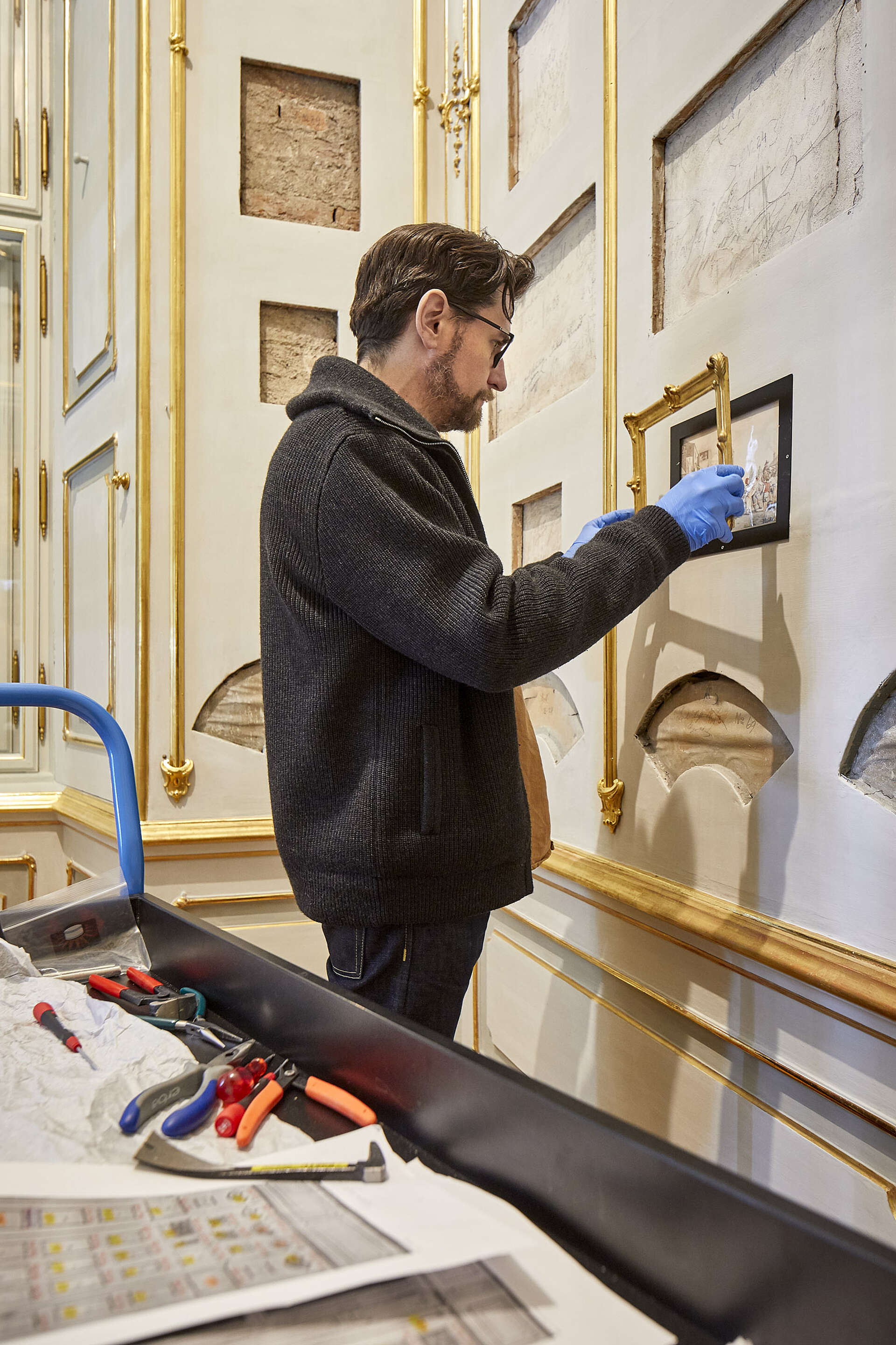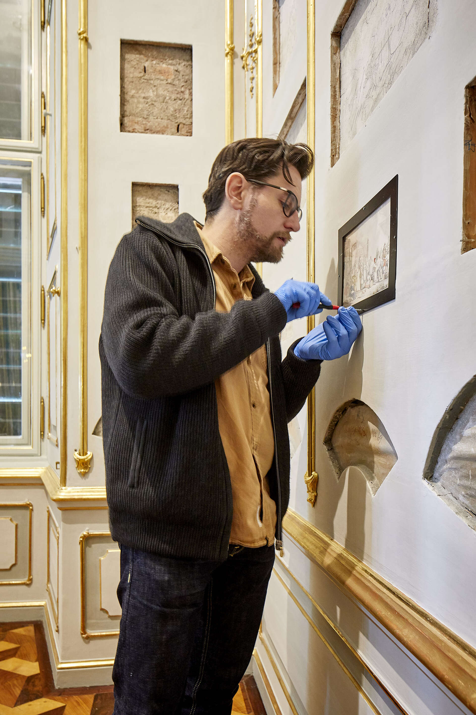 Das Miniaturenkabinett im südöstlichen Teil von Schloss Schönbrunn erfuhr seit Herbst 2024 grundlegende Befundungen, die als Basis für die Restaurierung des Bodens, des Plafonds, der Holzvertäfelungen (Boiserien) und der darin eingebrachten Bildnisse herangezogen wurden. Als Ziele definierten die beteiligten Expert:innen folgende Schwerpunkte: die Rückführung der Farbfassung der letzten bewohnten Phase vor dem Ende der Monarchie 1918, die Festigung der sich ablösenden Fassungsbereiche und die Neumontage der Miniaturen als Ausstattungselemente. Da zudem der Plafond eine starke Vergrauung aufwies, wurde eine Reduzierung dieses Eindruckes angestrebt.