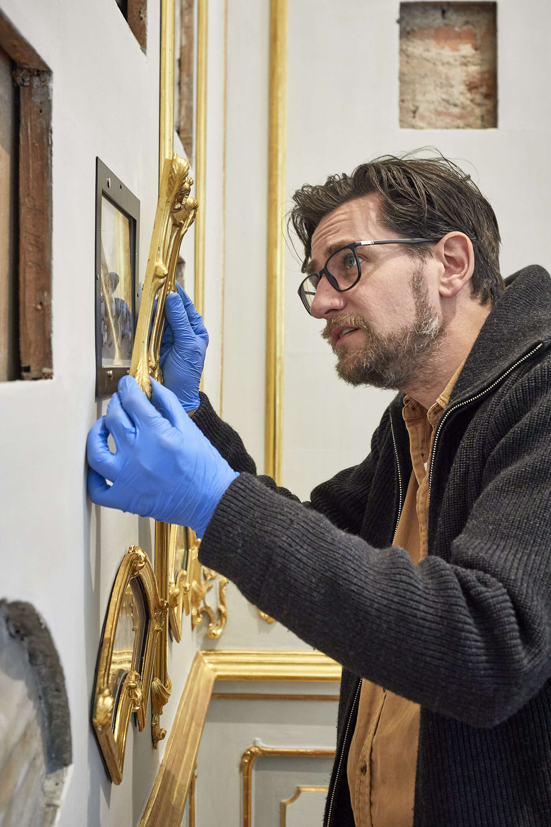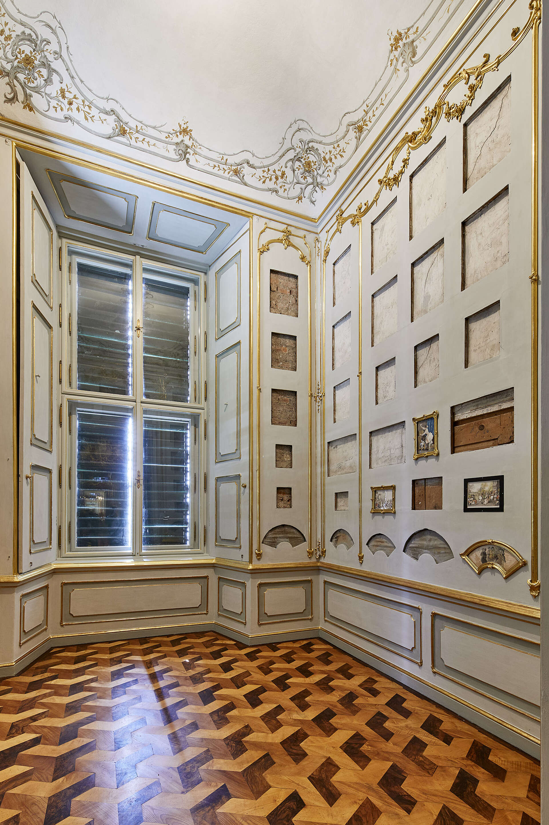 Eine weitere besondere Überraschung bot der Einsatz einer Mini-Kamera, die bei dem Rauchmelder durch den Plafond eingeführt wurde. Über der heutigen farbig gefassten Holzdecke befindet sich ein in weißer Farbe gehaltener, mit Stuck dekorierter Raumabschluss, der mit großer Wahrscheinlichkeit aus der ersten Ausstattungsphase des Schlosses durch Maria Theresia um 1740 stammt.